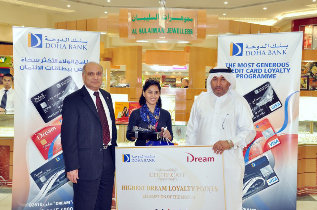 انطلاقاً من جهوده المتواصلة لتسليط الضوء على خيارات استبدال النقاط المتاحة لحاملي بطاقات دريم الائتمانية، أعلن بنك الدوحة عن تحقيق أعلى نسبة استبدال لنقاط الولاء خلال شهر مارس ٢٠١٣ لدى مجوهرات السليمان، حيث كان هذا الإنجاز من نصيب عميل البنك السيد هادي رشدي إبراهيم الذي استبدل ٨٤٫٠٠٠ نقطة دريم في عملية شراء واحدة. وبلغت نسبة استبدال النقاط من القيمة الإجمالية لعملية الشراء ٤٫٢٠٠ ريال قطري.